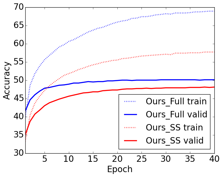 Figure 2. Training and validation accuracy of Ours_FULL and Ours_SS. Both Ours_FULL and Ours_SS use a single-step for prediction, but trained differently. Ours_FULL is trained with proposed multi-step joint loss minimization and early-stopping, and Ours_SS is trained with single-step prediction loss minimization.